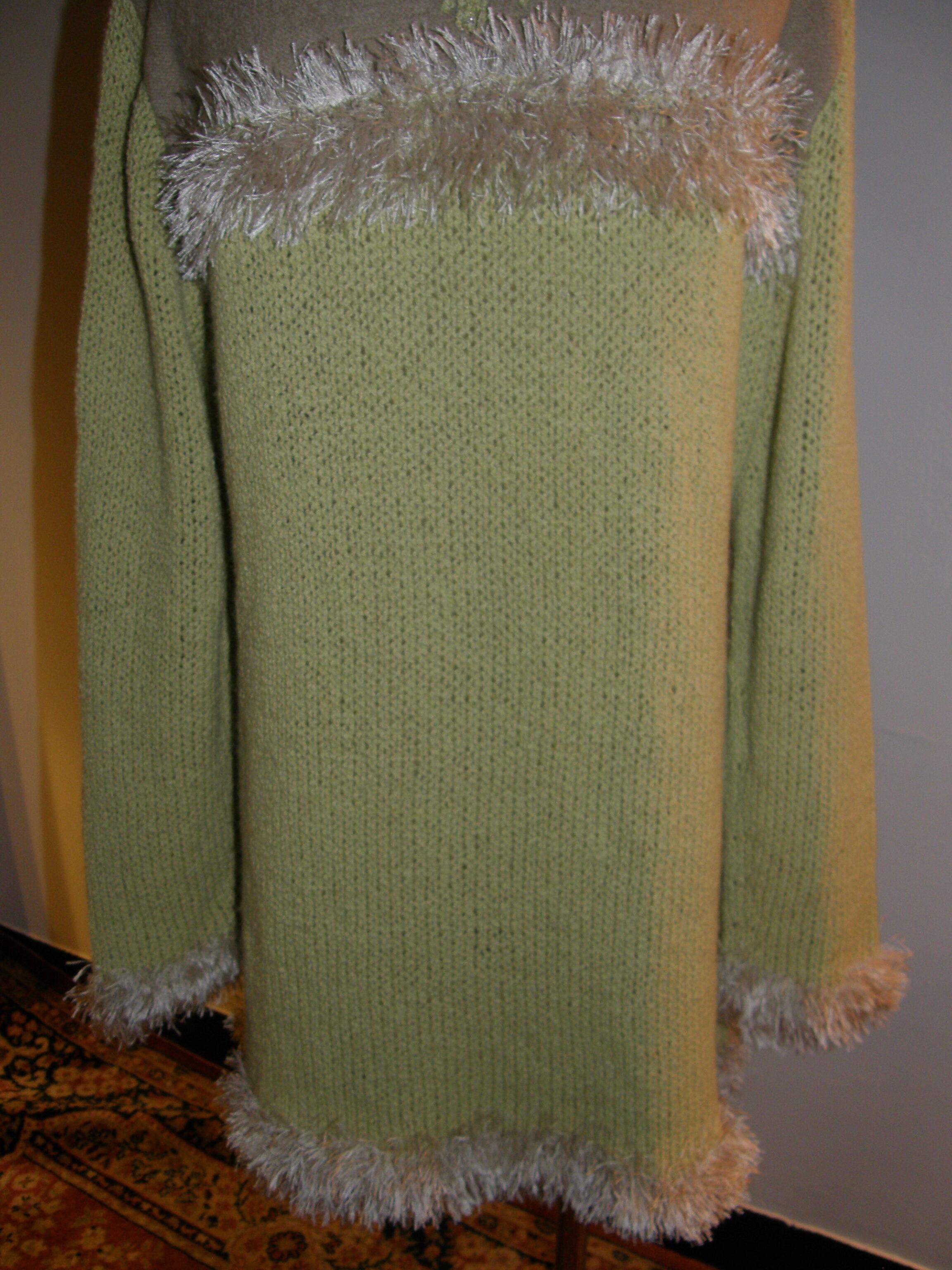 イソギンチャクのようなアイボリーの毛足の長いファーと明るすぎない黄緑のちょうどよく可愛い色味バランスにスパンコール付きのお花が咲いたなんだか動きだしそうな、ニットカーディガンです。