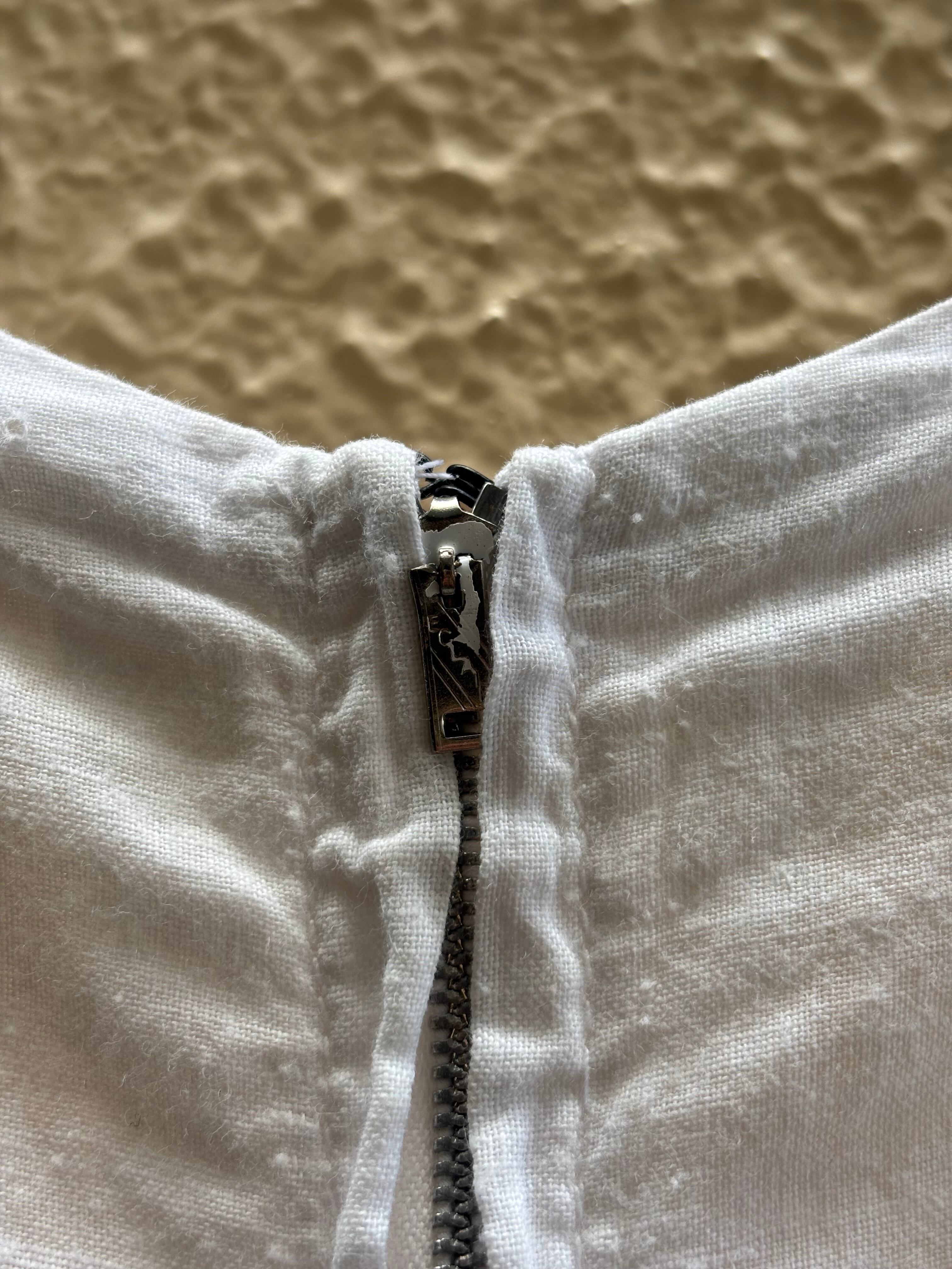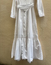 EURO vintdgeでこのような白のマキシ丈ワンピースはよく見かけますが、こちらはレースの入り方と霊の頭についている額烏帽子のようなウエストデザインが特徴的で惹かれます。