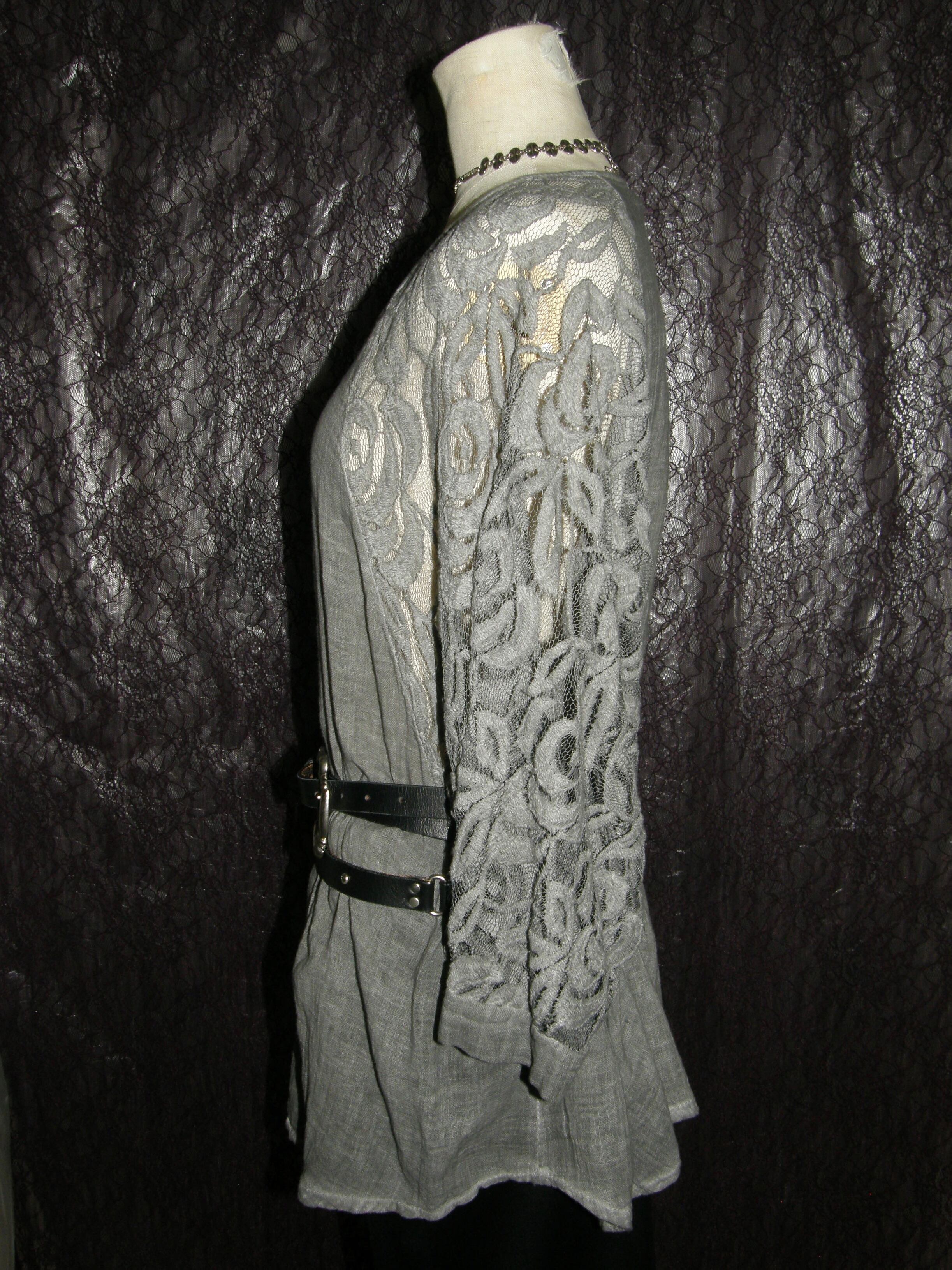 薔薇のような大きなお花のレースとオーバーなシルエットと麻のサラッとした素材感で全体のバランスが良く、クールだけど女性らしい印象のブラウス。