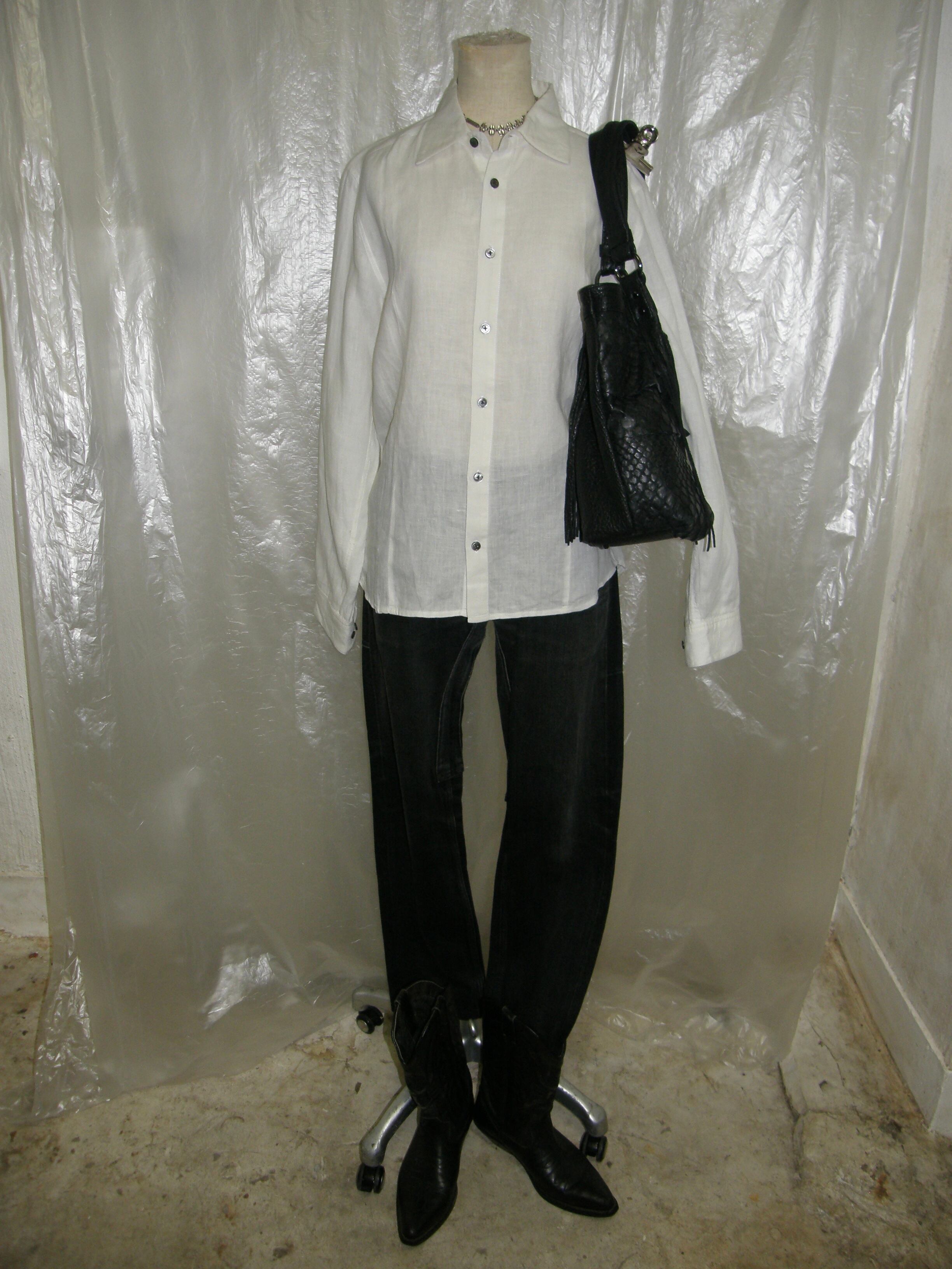 キレイめの白シャツには珍しい.光の加減によって色が変わって見えるぽってりとしたボタン、裾の方に入れられた半分だけ見えるブランドロゴ、とても綺麗なシルエットからシンプルながらスタイリッシュに見せてくれます。