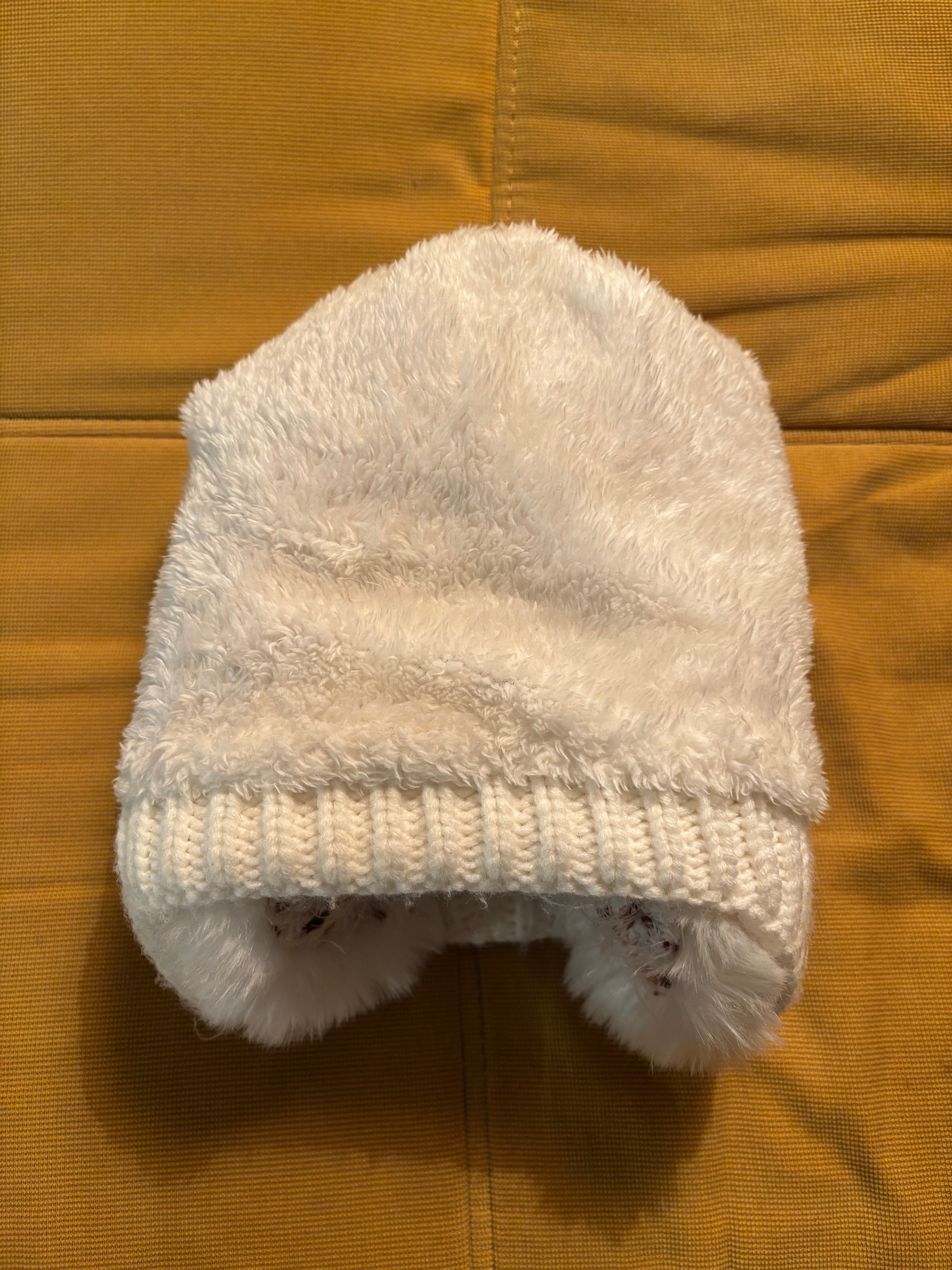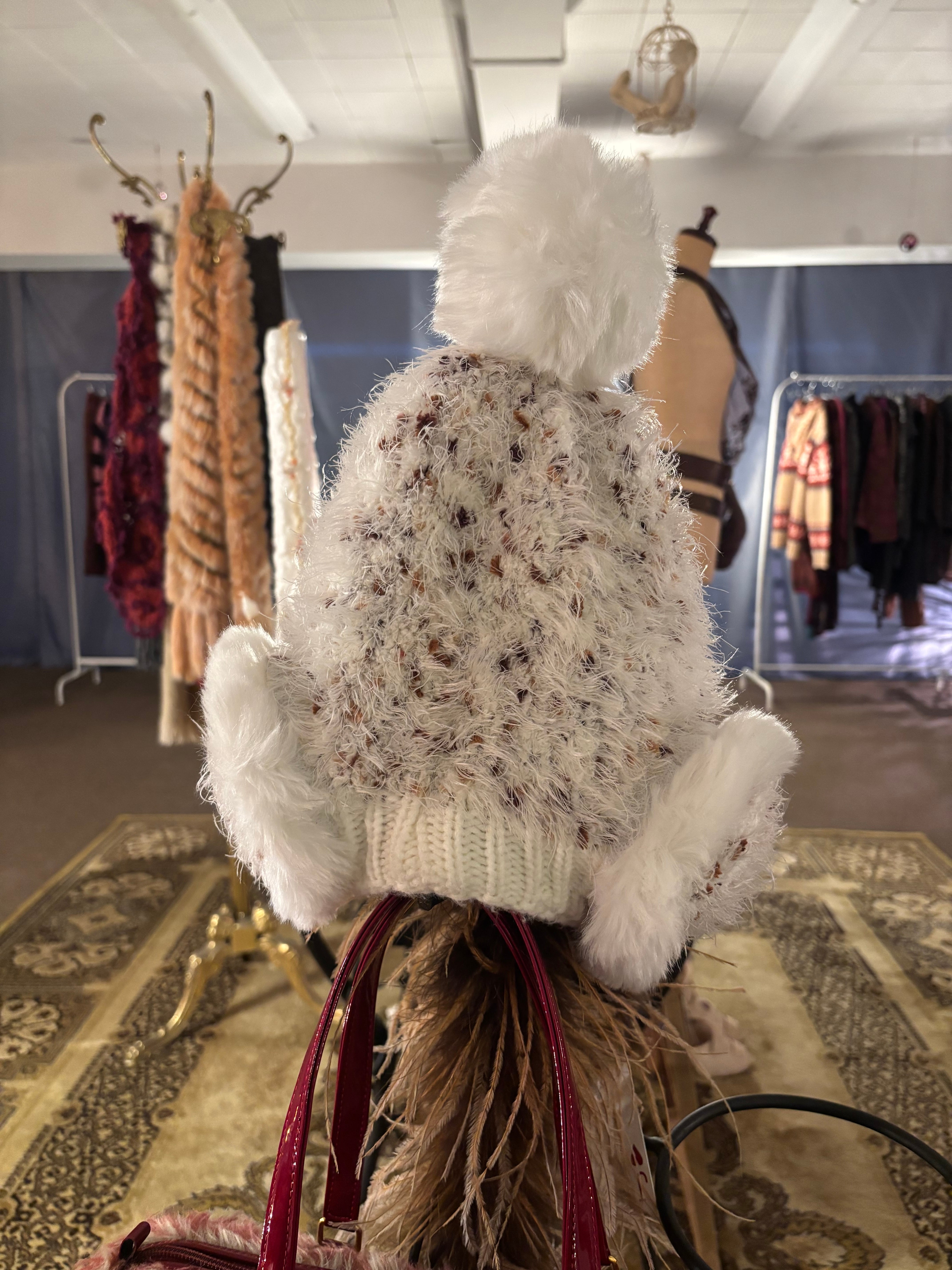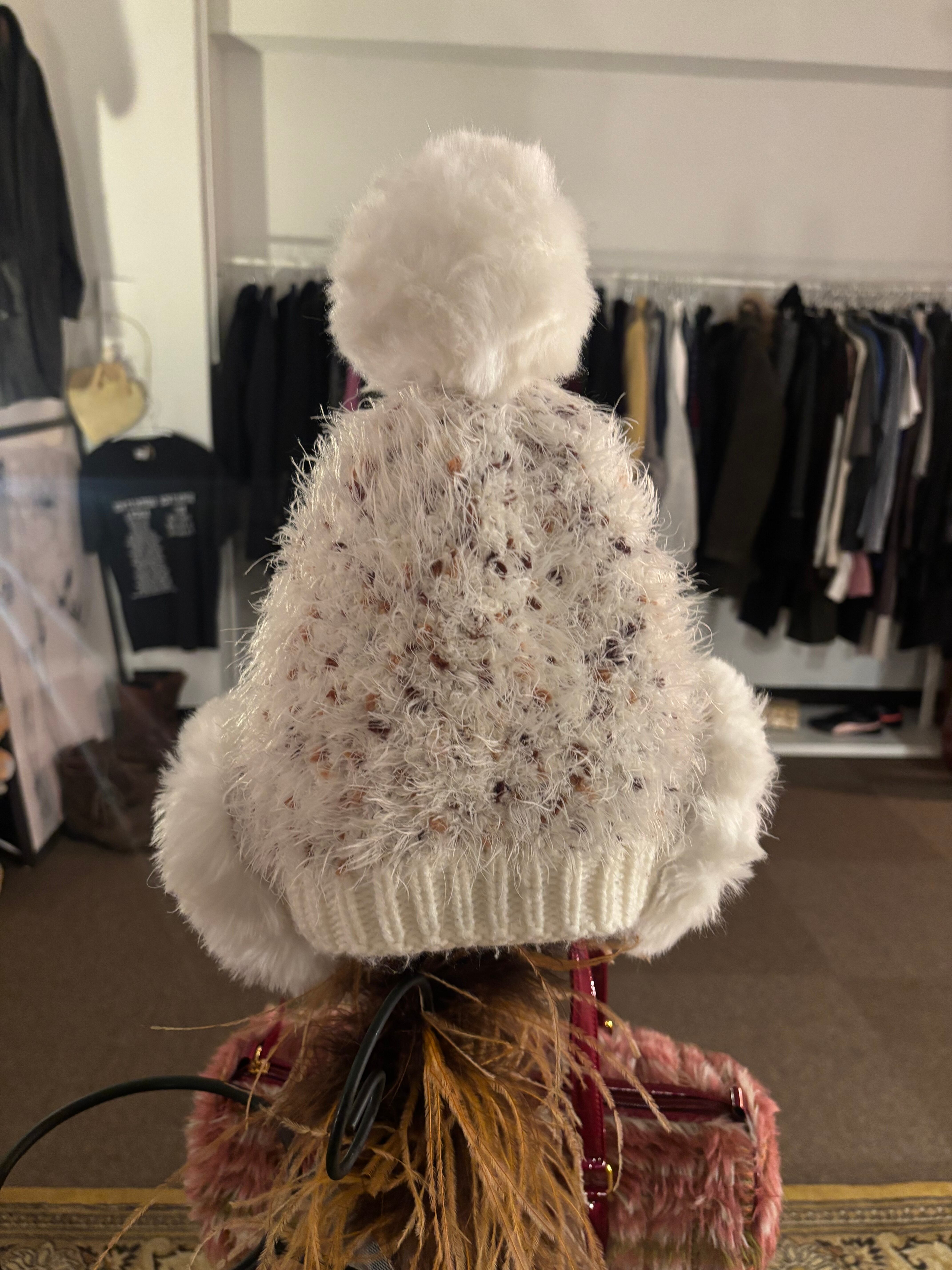 白地にくすみのかかったボルドーとオレンジな色合いと、耳あて付きの大きめシルエットが可愛いニット帽。