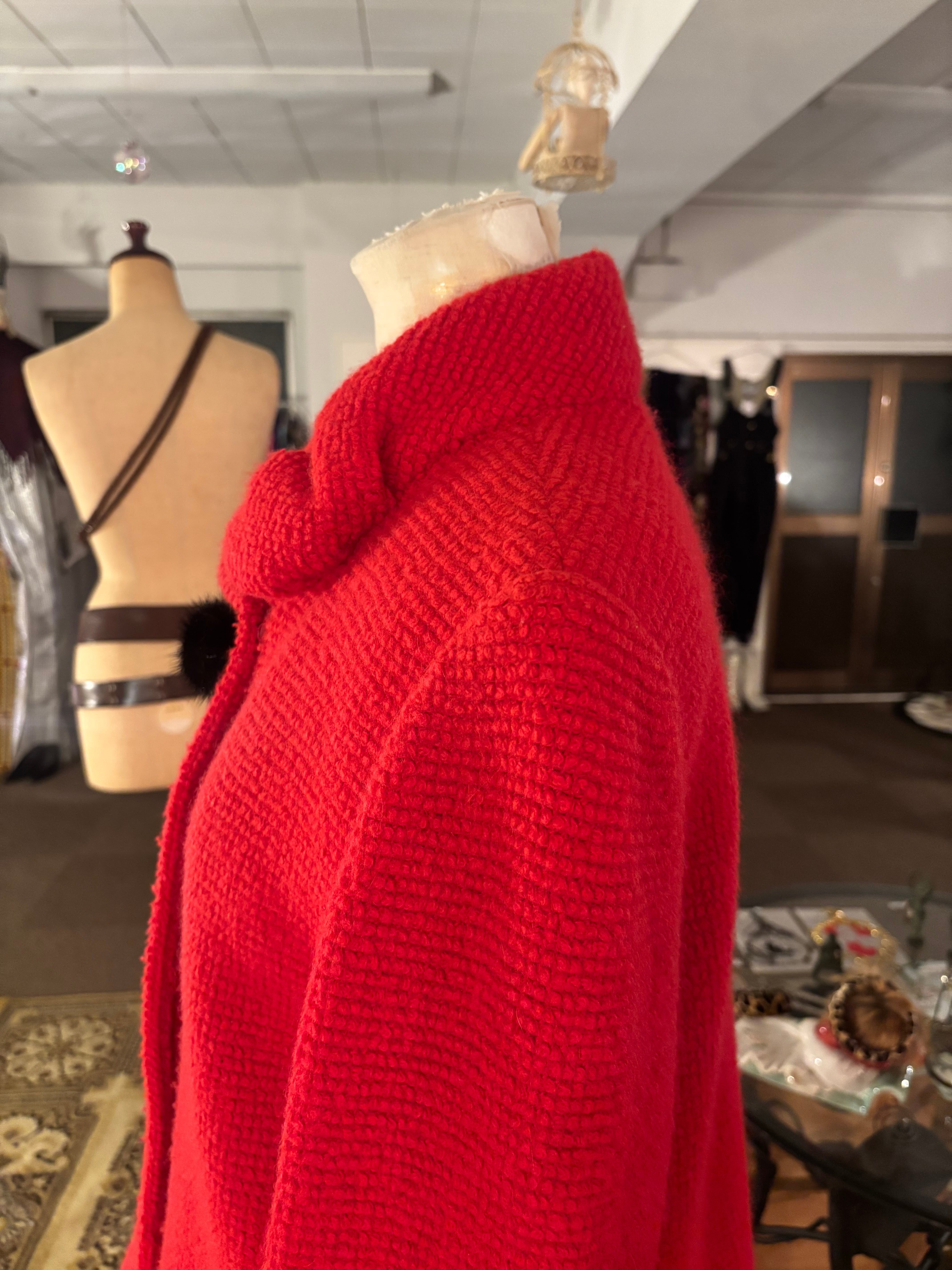 表情のあるブークレ調の立体的であたたかみのある素材感と赤とピンクの中間のような色味が目を引く一着。