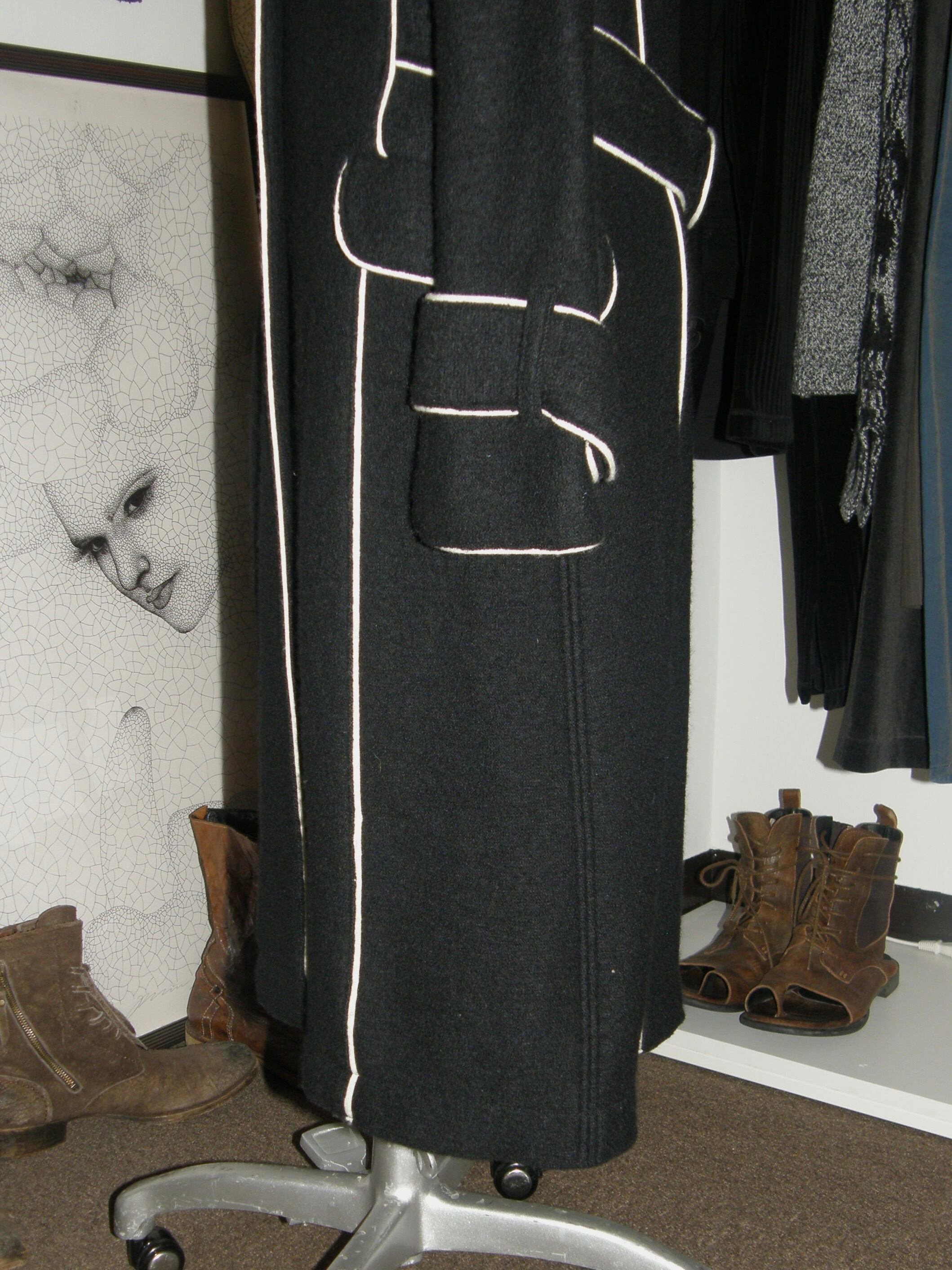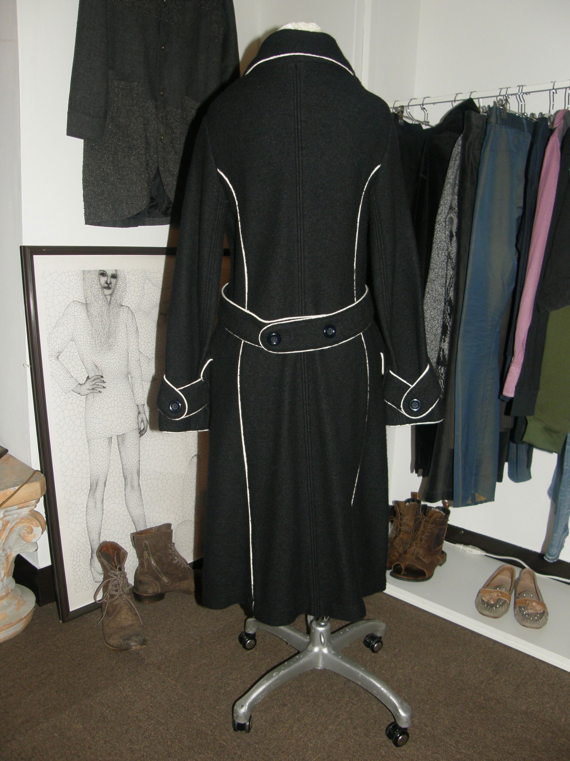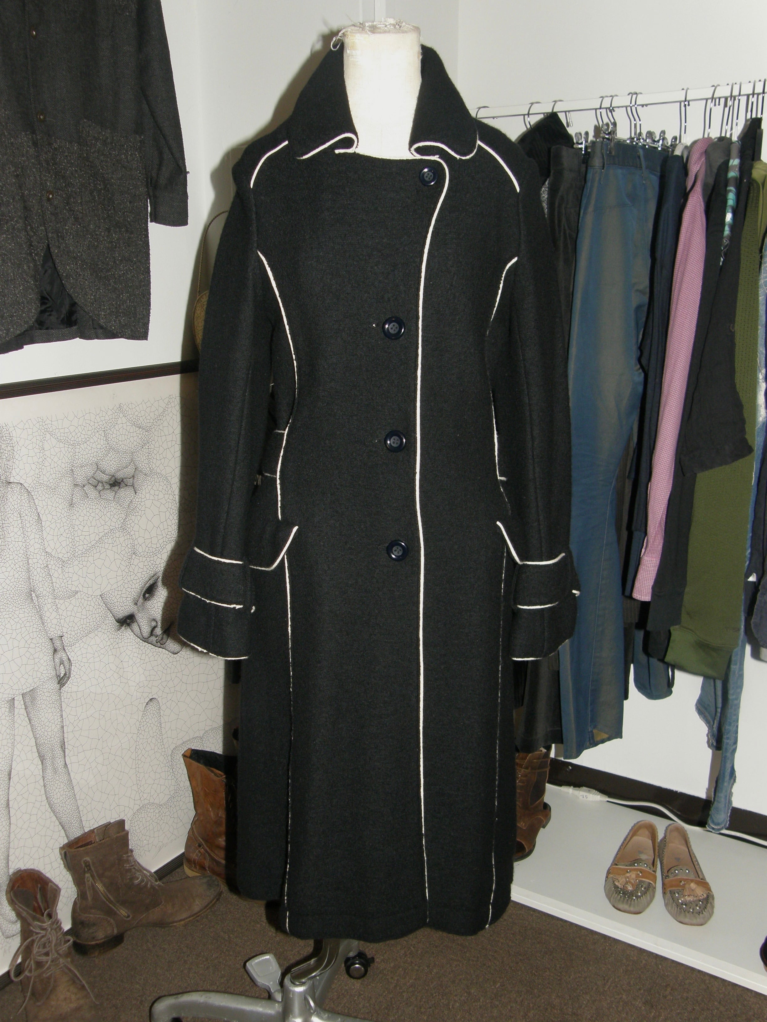 日本製のアイテムで、構築的なシルエットにアイボリーのパイピングが映える品ある一着です。