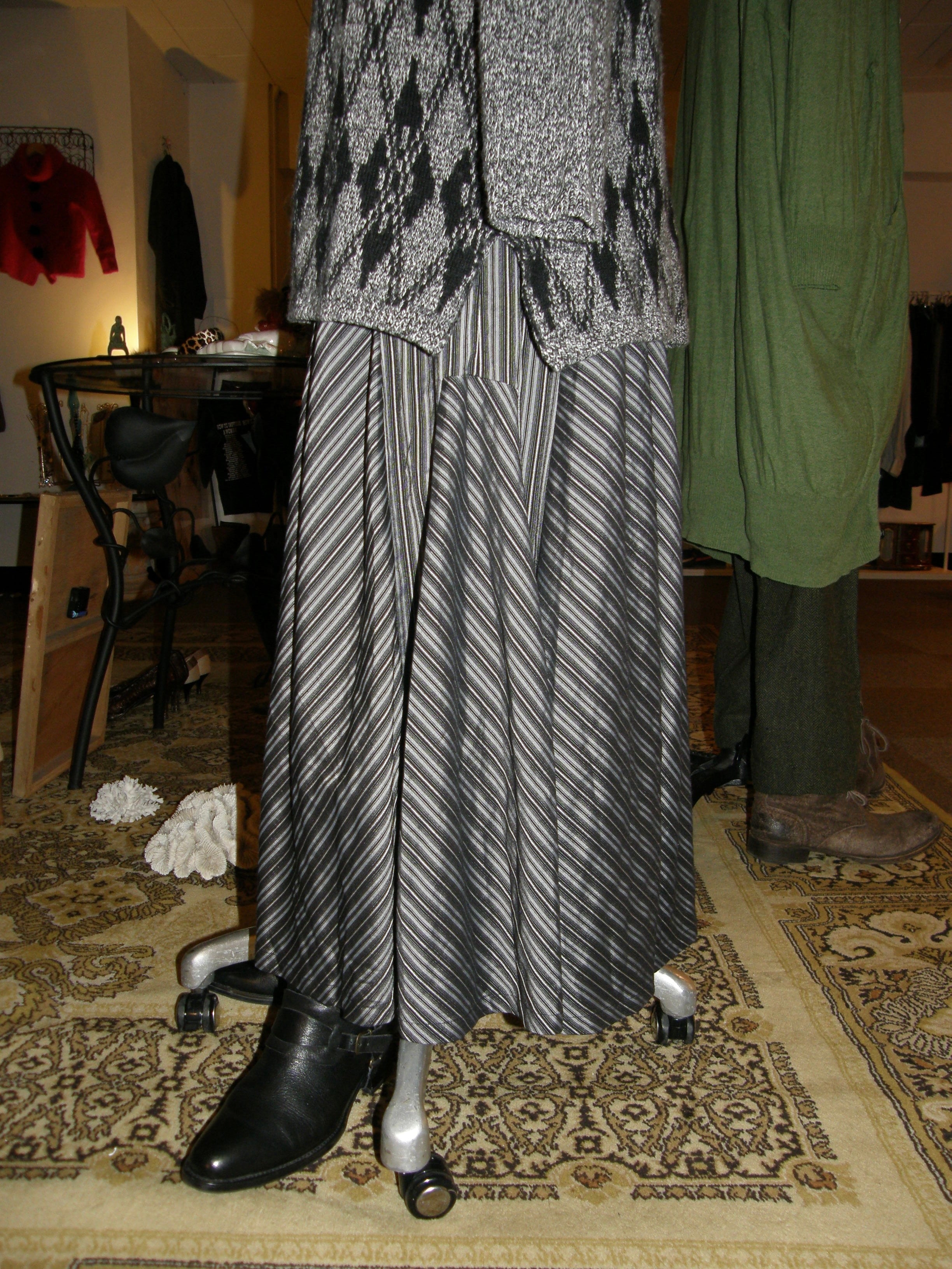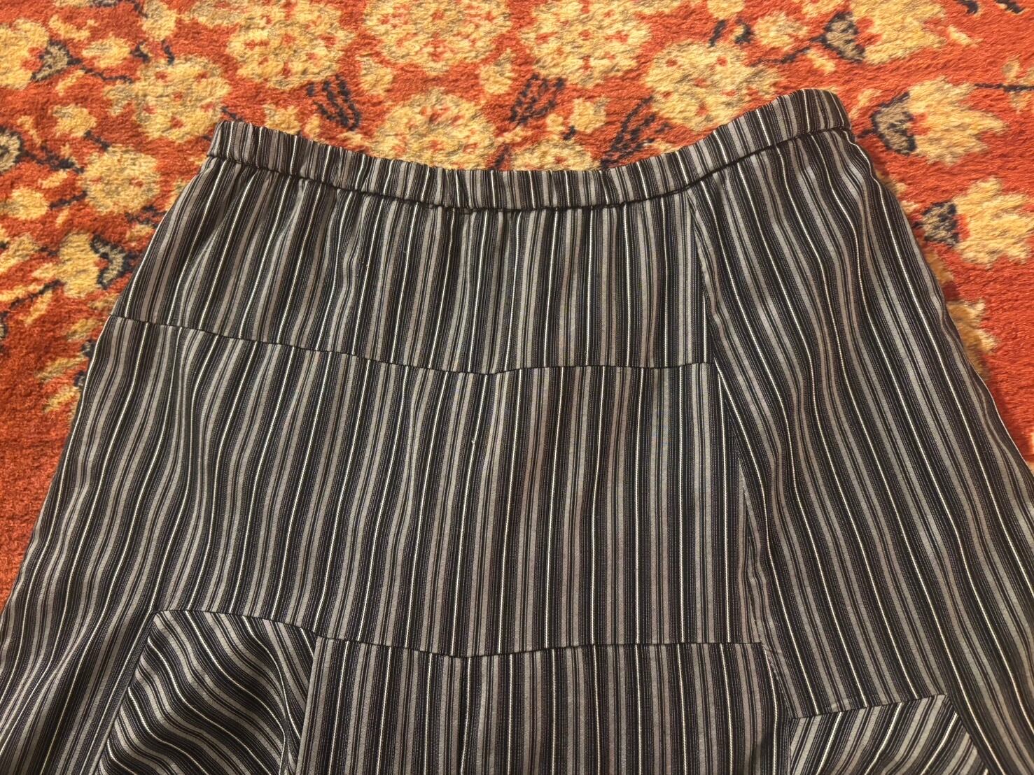 幾何学的なストライプ柄をパネルごとに切り替えた、凝った作りのプリーツスカート。