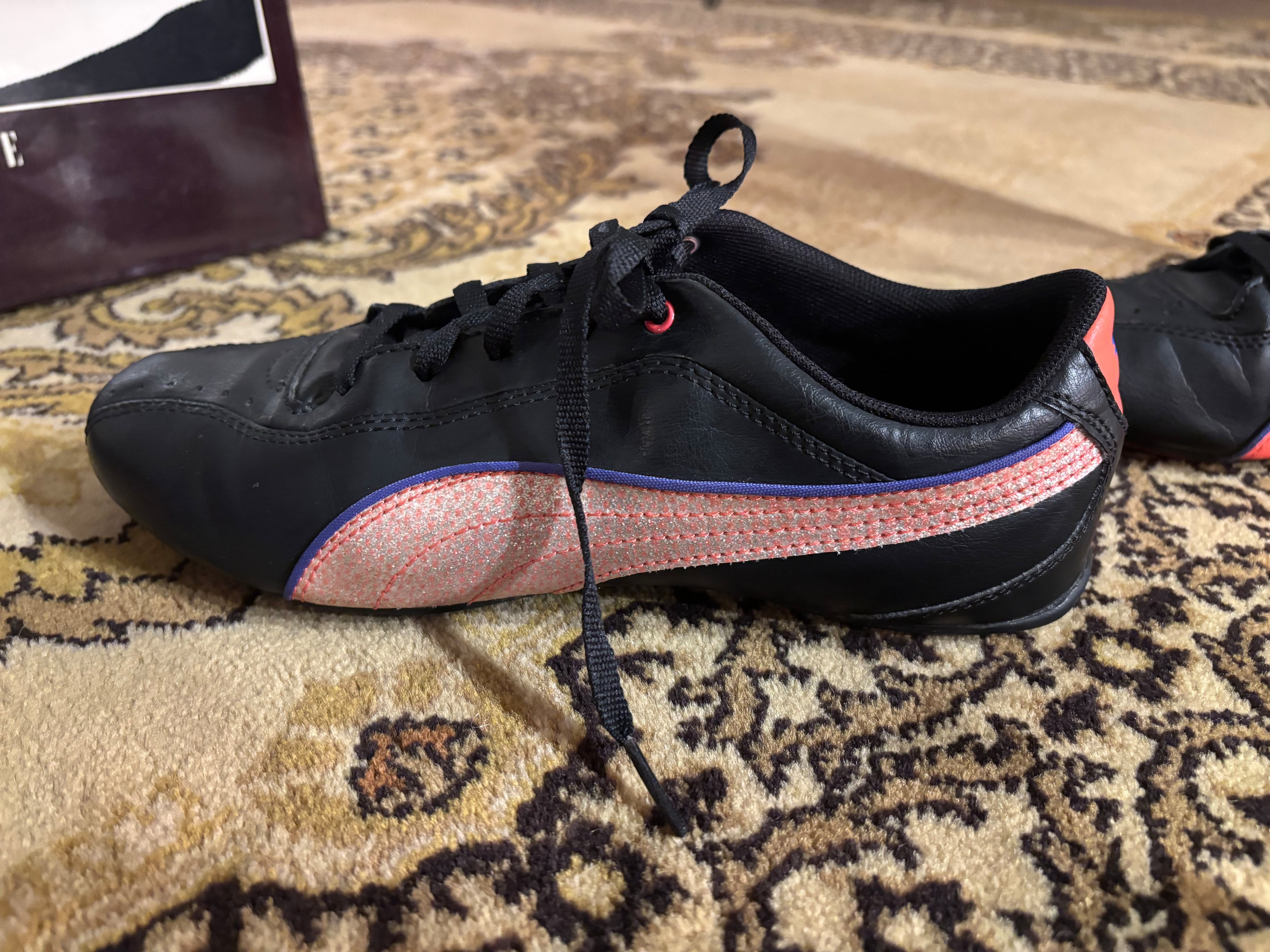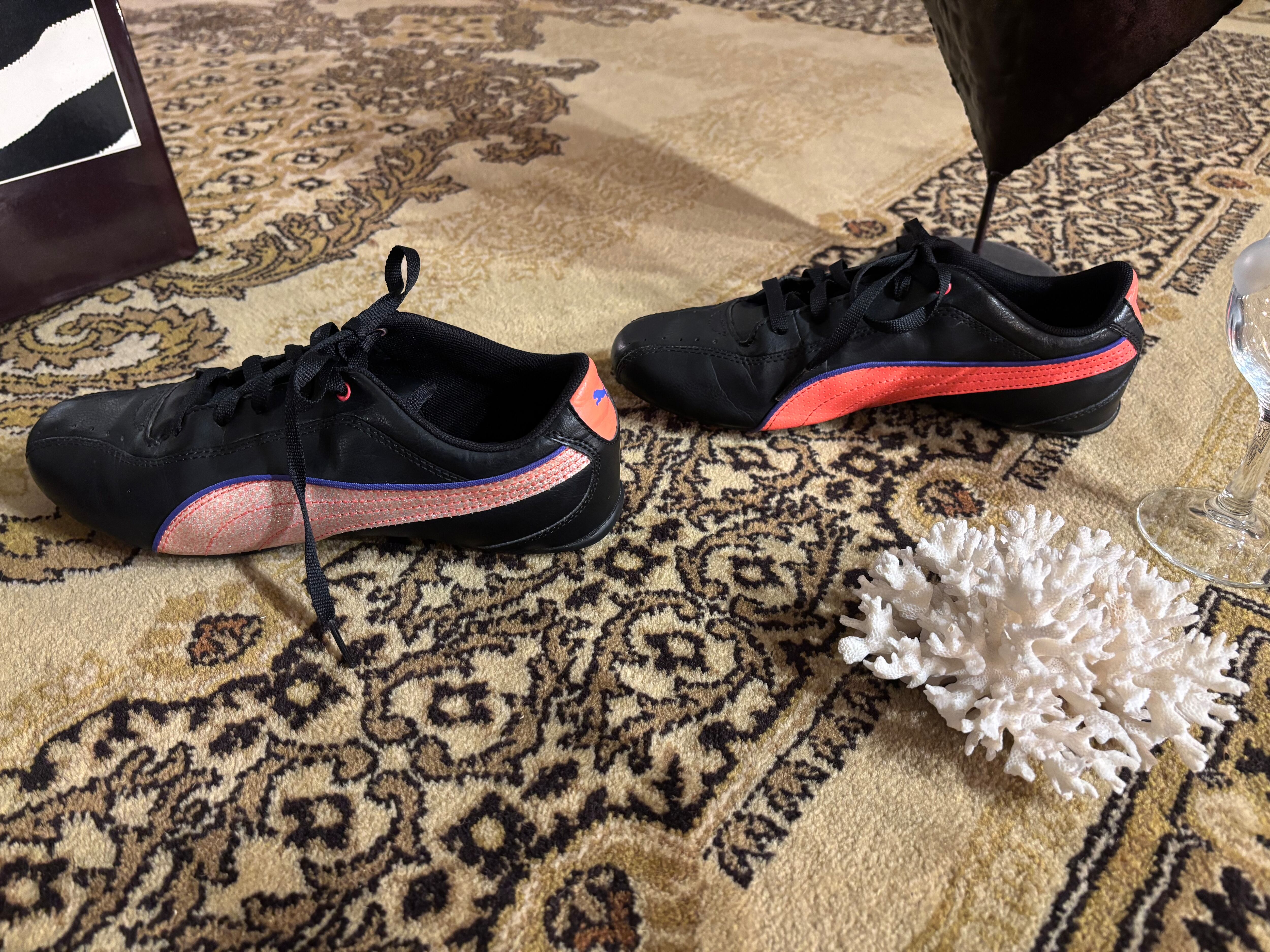 シルバーラメに青みパープルの縁どり、サーモンピンクのステッチと色使いがとても可愛いです。ブラックレザーのベースとの相性が良いバランス感です。