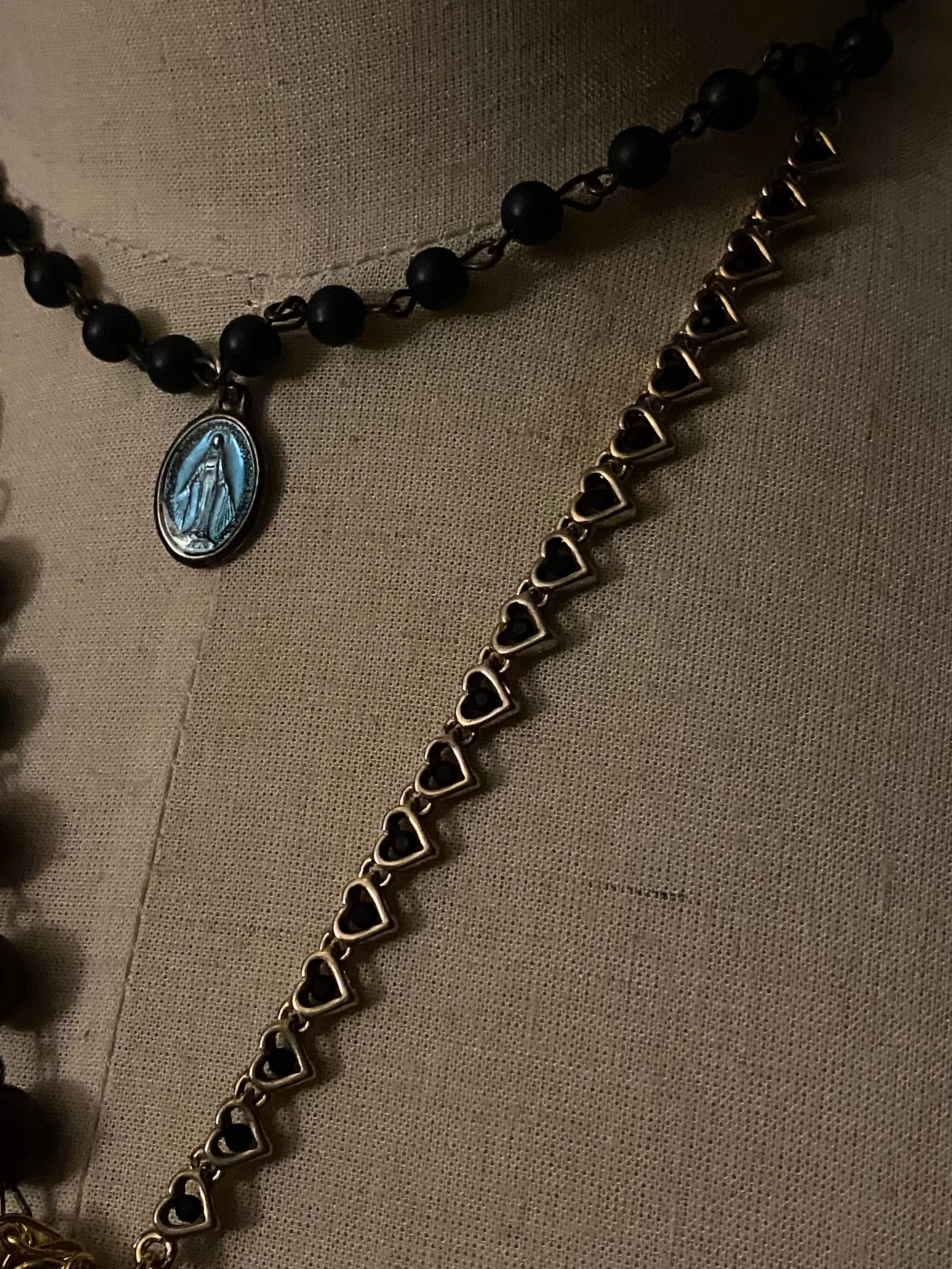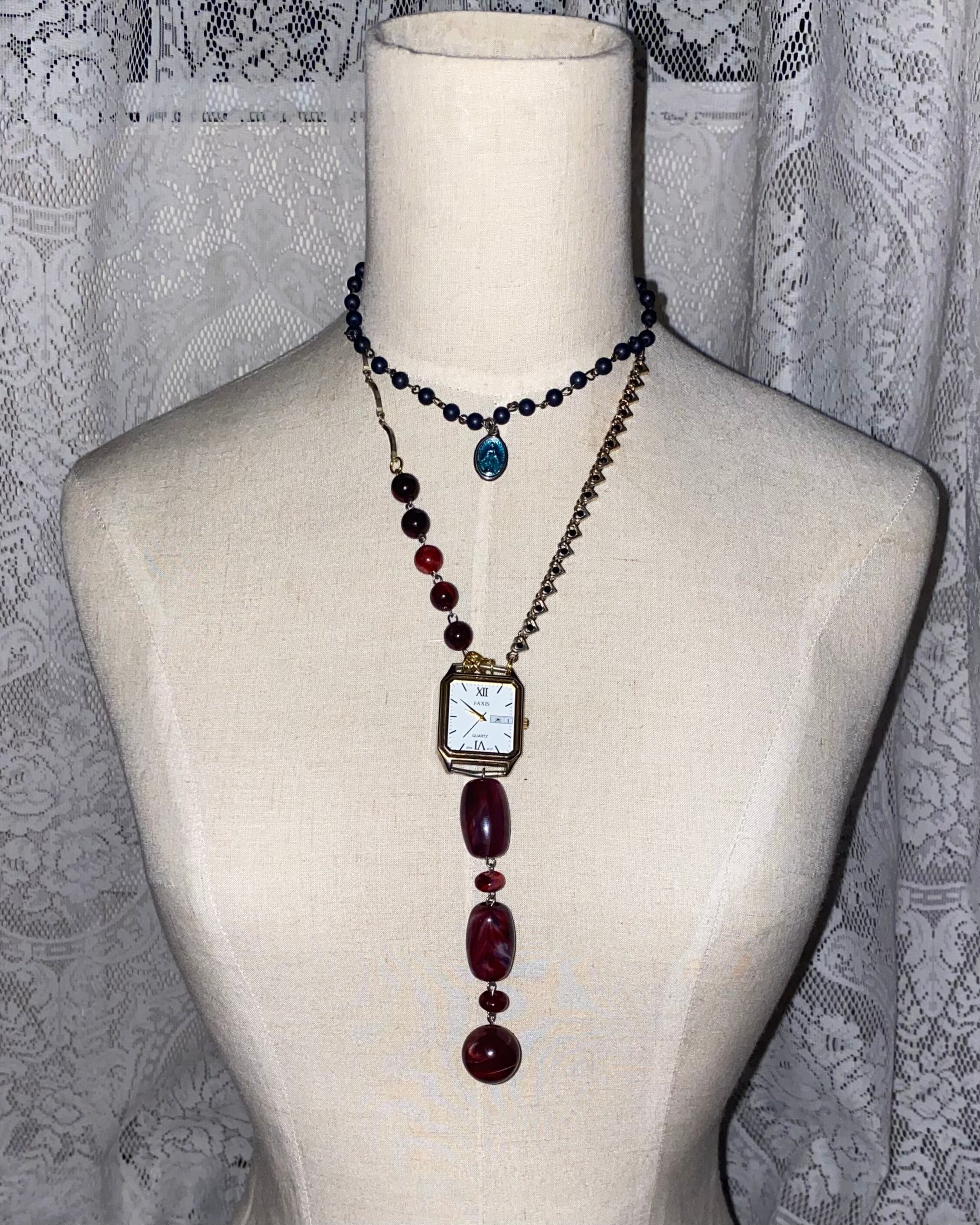 ブルーベリーのようなマットな紫のビーズ、黒のクリスタルの付いたハートチェーン、斑模様になっている2つの形の深紅の大ぶりビーズ。
