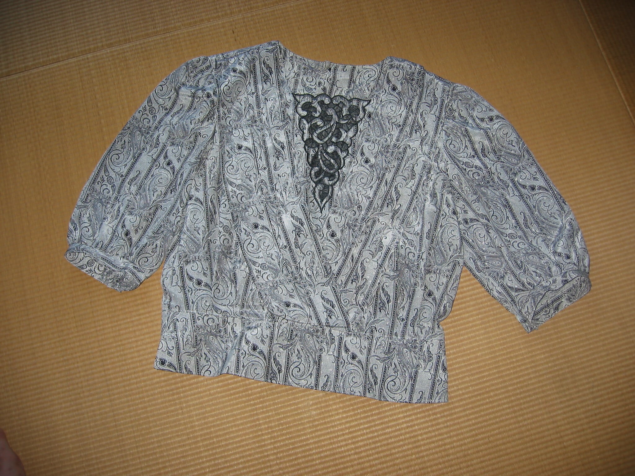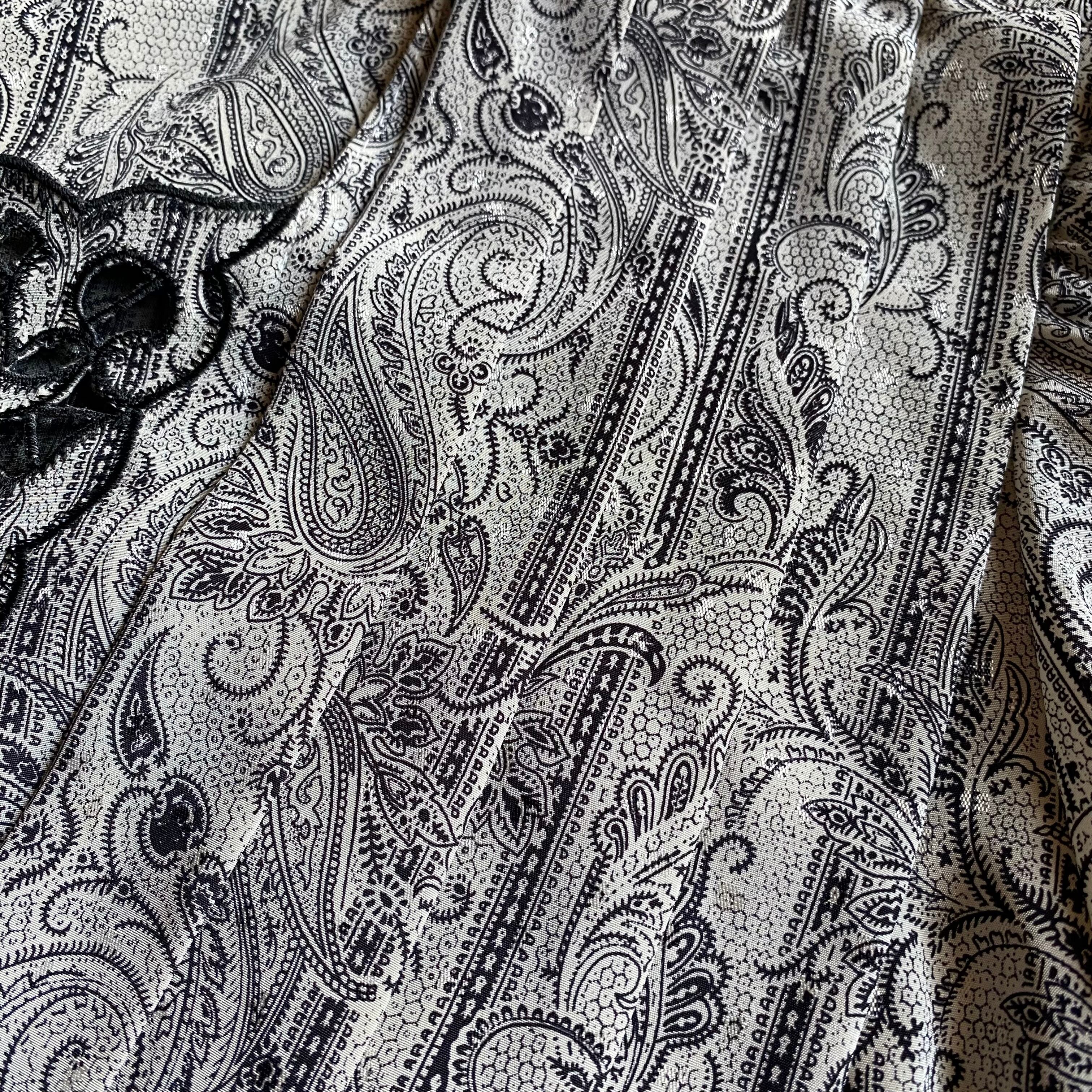 他にも胸元のシースルー刺繍だったり、袖口の恐らくビンテージであろうボタンであったり、写真だと分かりにくいですが光に当てるとペイズリーの中に細かなシルバーの斑点が入っており素材自体もとても面白く推しているアイテムです。