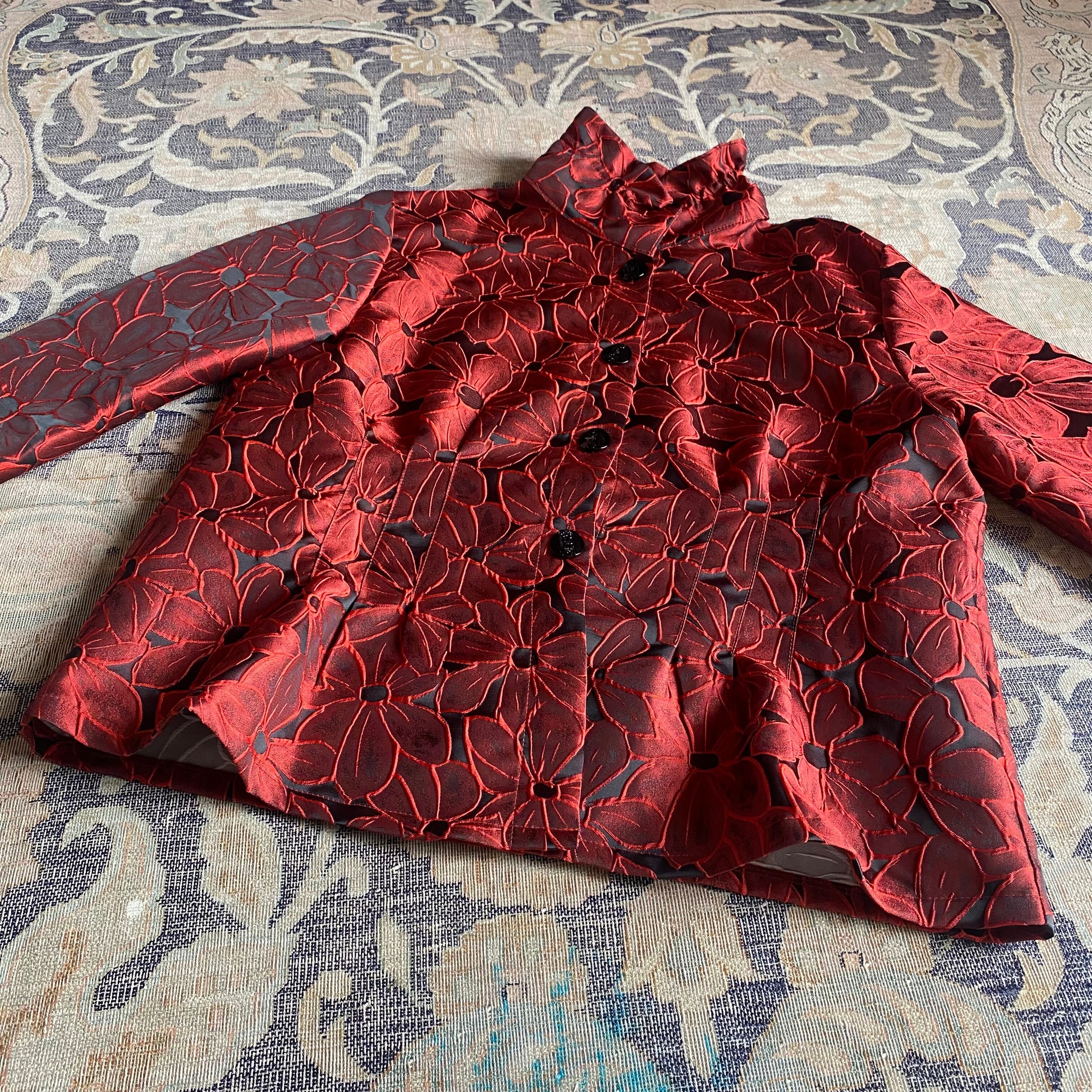 艶感、ハリ感のある凛とした素材に個人的に大好きな赤黒の強いい色合わせで全体に散りばめられたお花が1度見たら忘れられないブラウス。