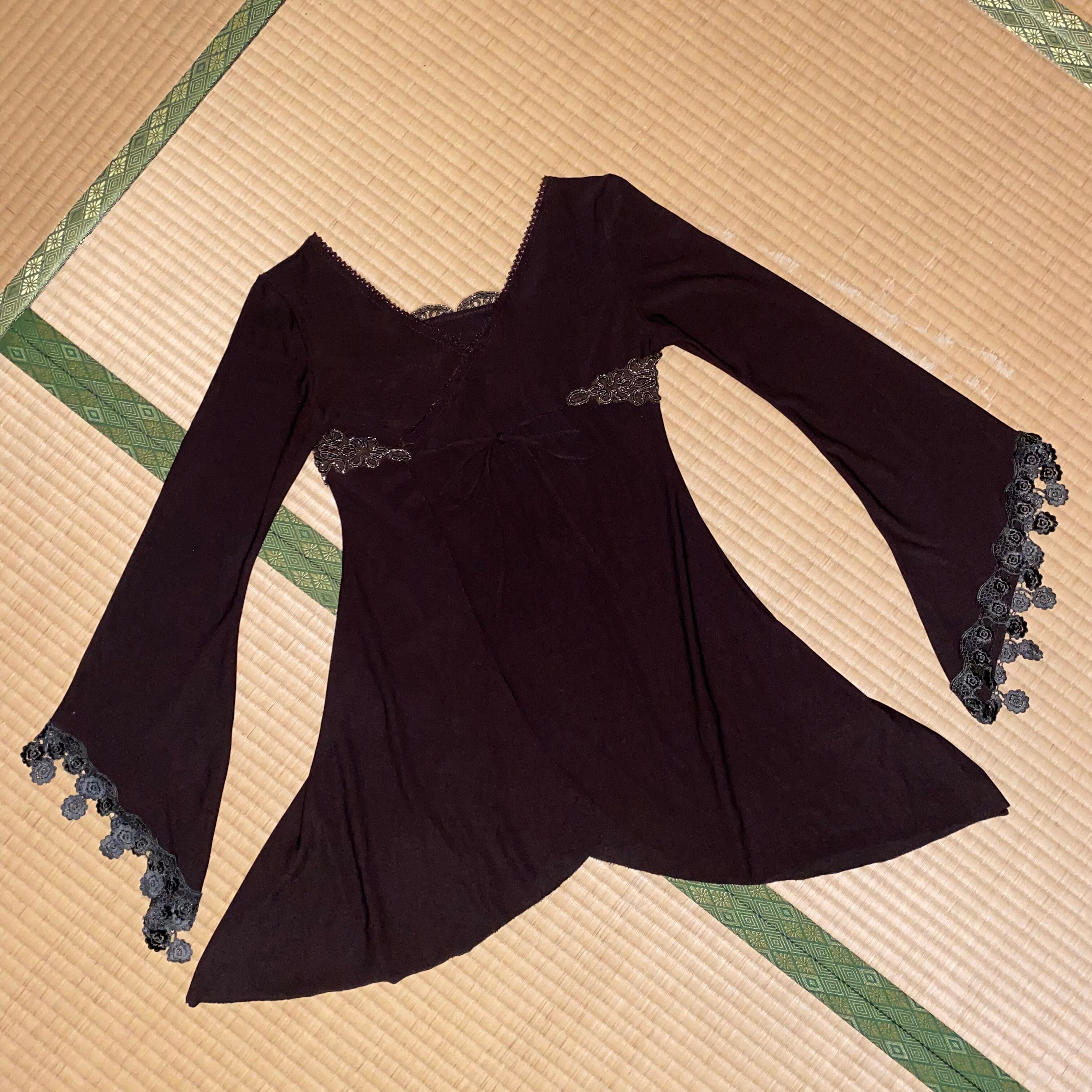 かなり奇妙な形の身頃(チューリップの花びらのように薄手の布が重なり合っています)にフレアな袖がついています。着用すると見頃もフレアなシルエットになります。