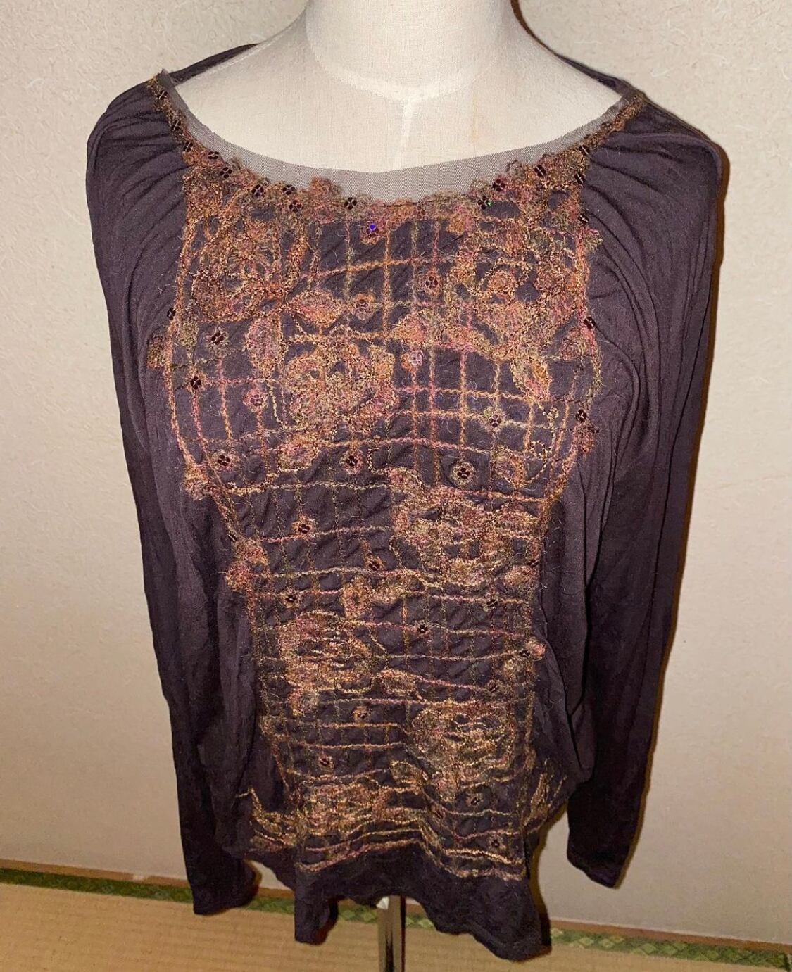 地のロンTも伸び.肌触り共に良く、長めな袖は若干ドルマンになっておりシルエットまでこだわりを感じます。しっかりとダーツが入っており着用すると中央の刺繍部分の両サイドがドレープのように溜まります。
