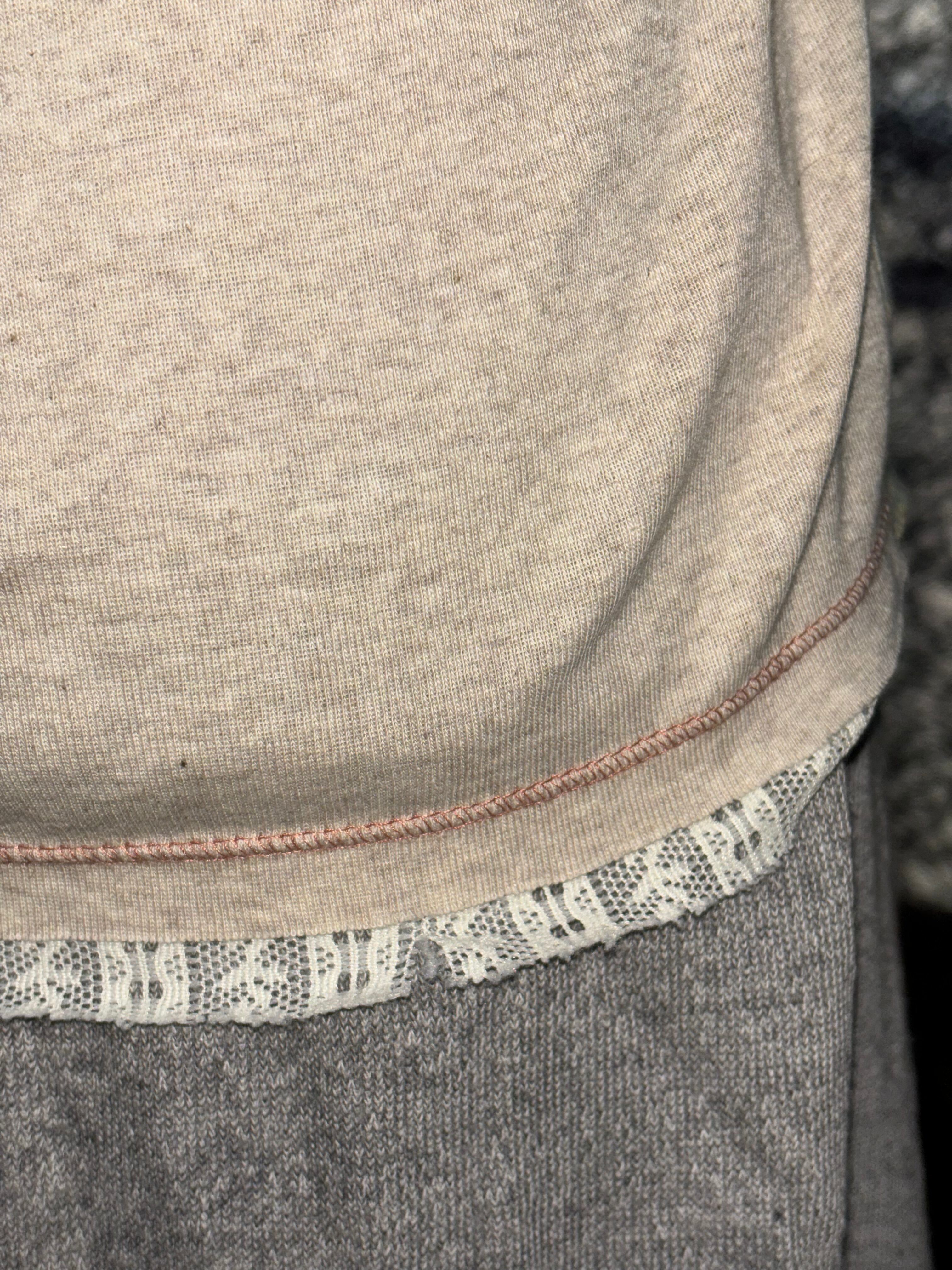 袖部分が素材切り替えになっていたり、胸元やそのサイドがレースアップになっていたり、裾にレースがあしらわれていたりこだわりを感じる1着。