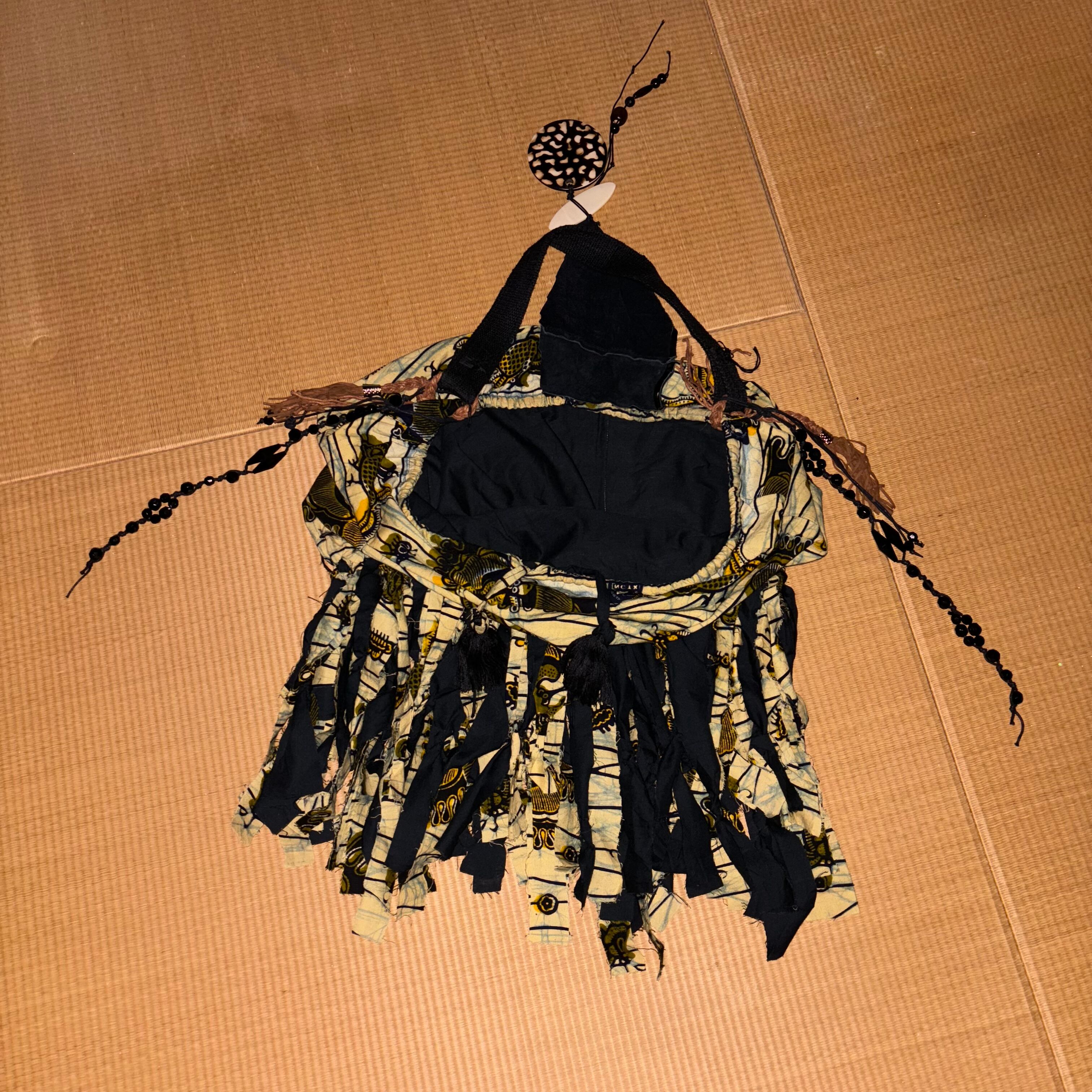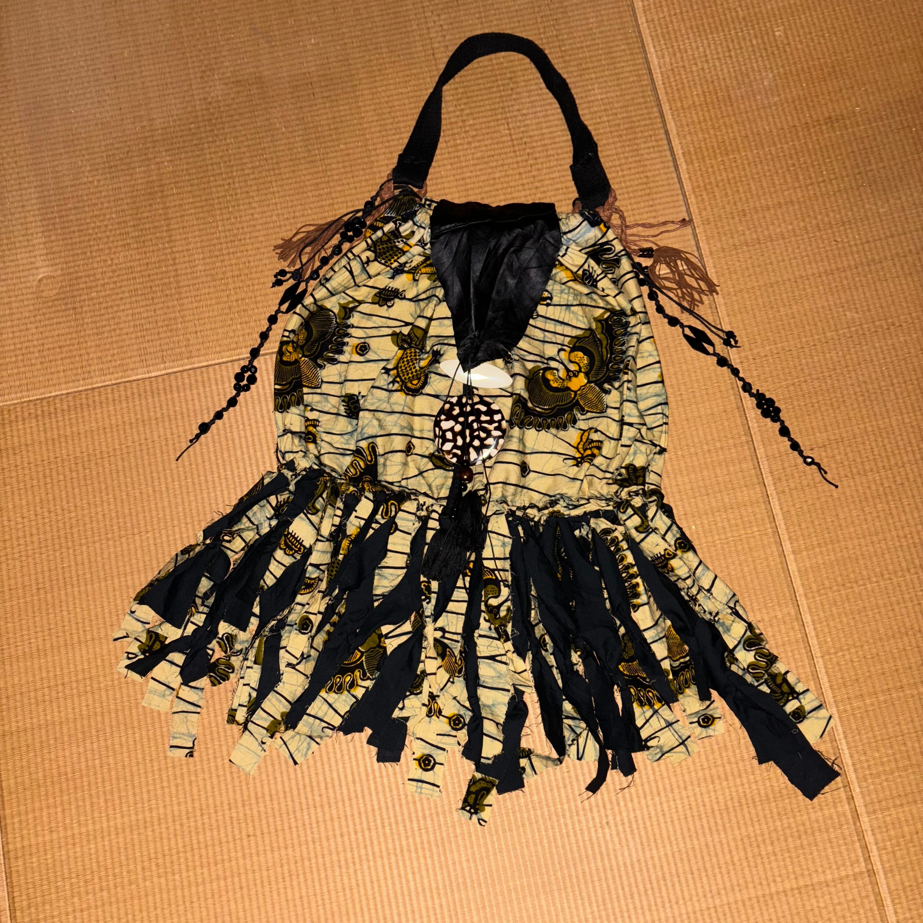部分的にレザーが使われていたりおおきなビーズが使われていたり、なんと言ってもボリュームのありすぎるフリンジがインパクト大で可愛いです。
