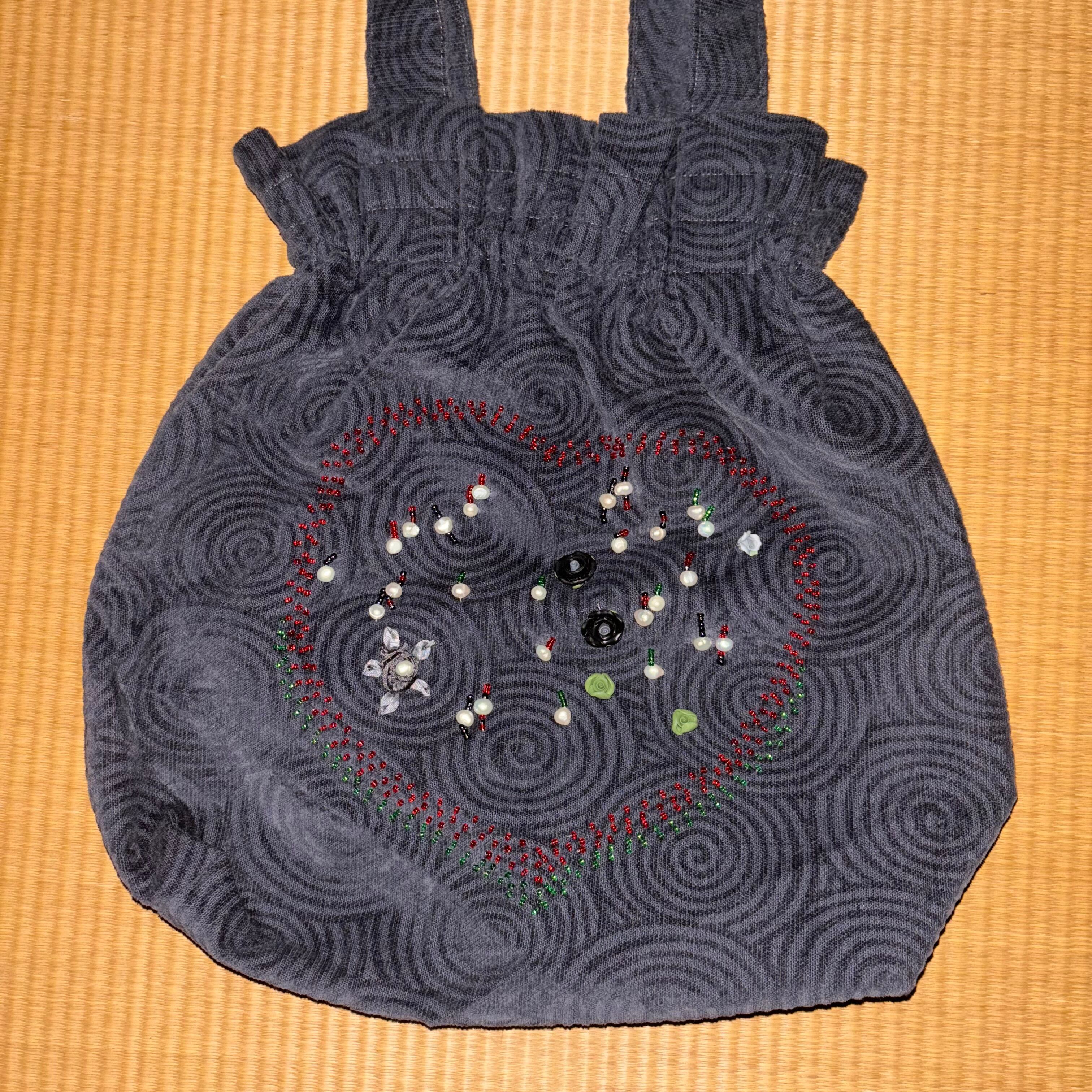 表面は今までに見た事のない渦巻き柄の珍しいベロア地に、桃を連想させるような不思議なバイカラーでハート状に刺繍されたビーズ。その中に雨粒のように滴るパールと薔薇がやっぱり不思議で独特さを感じる可愛さです。