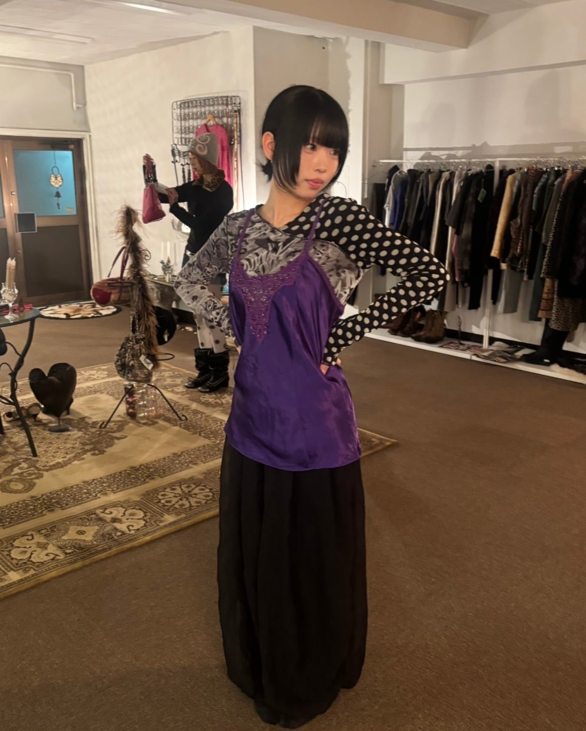 ダークなパープルのサテンにレースとスパンコールがあしらわれたキャミソール。