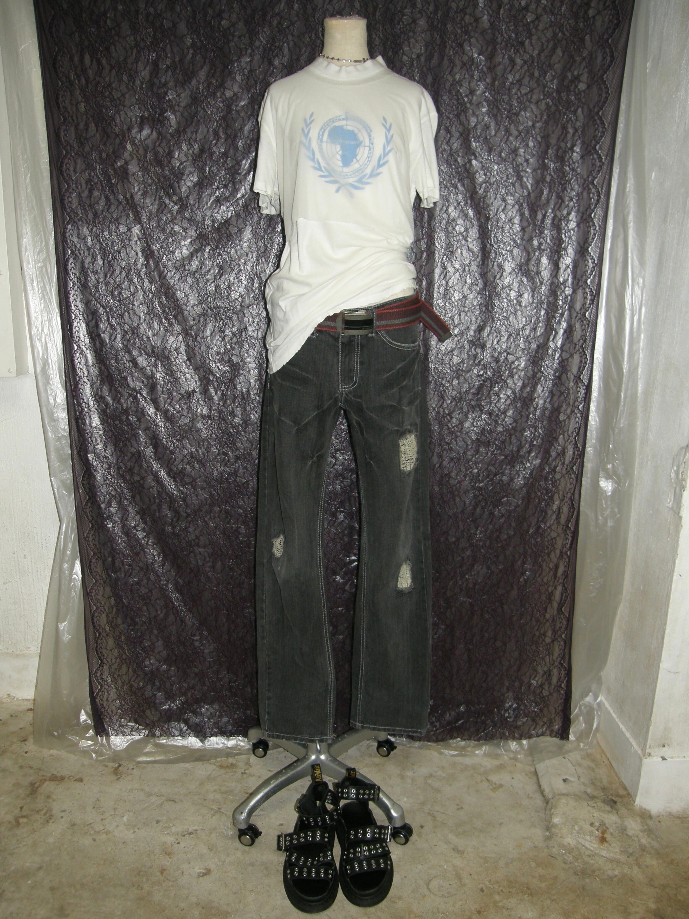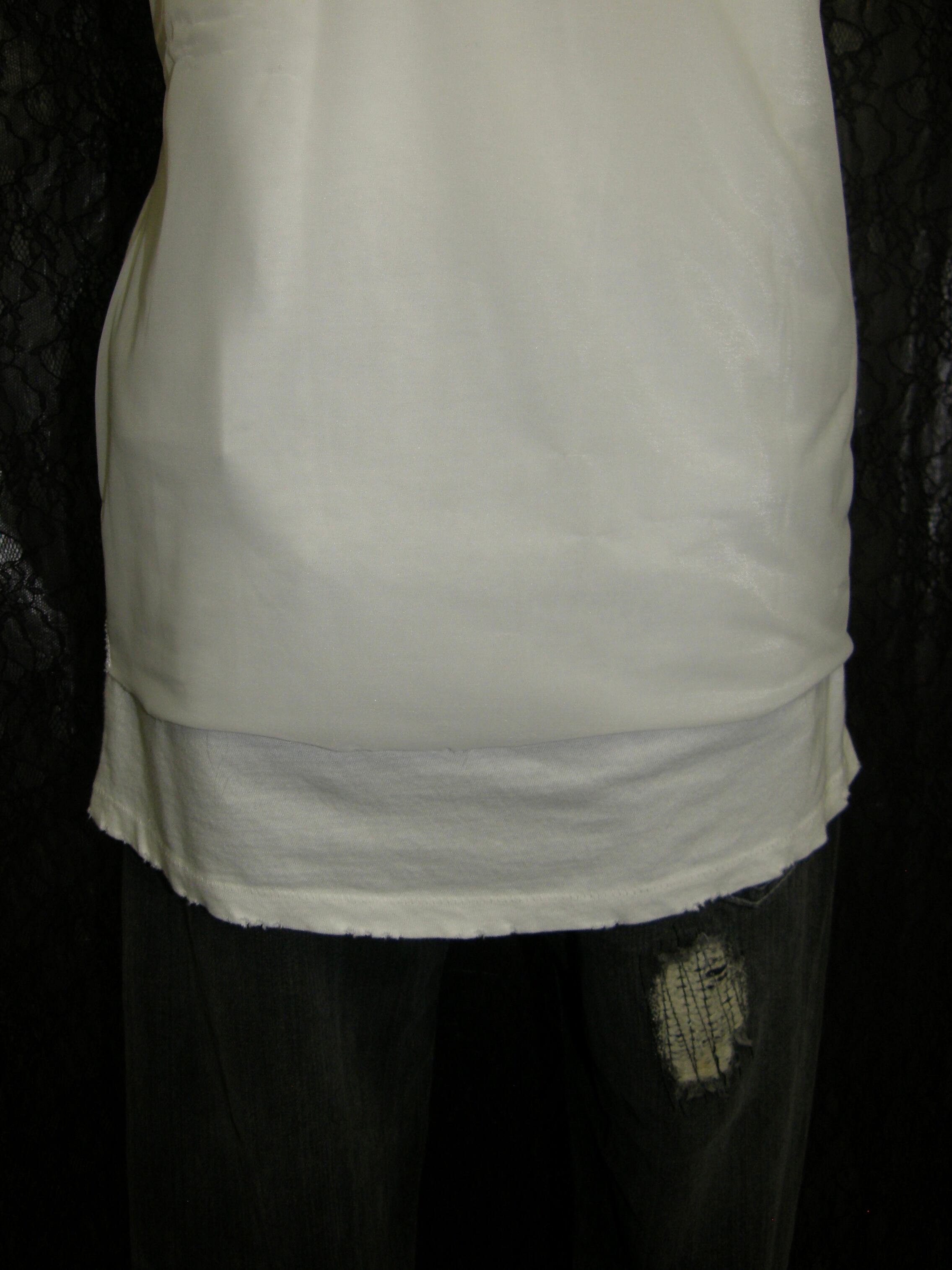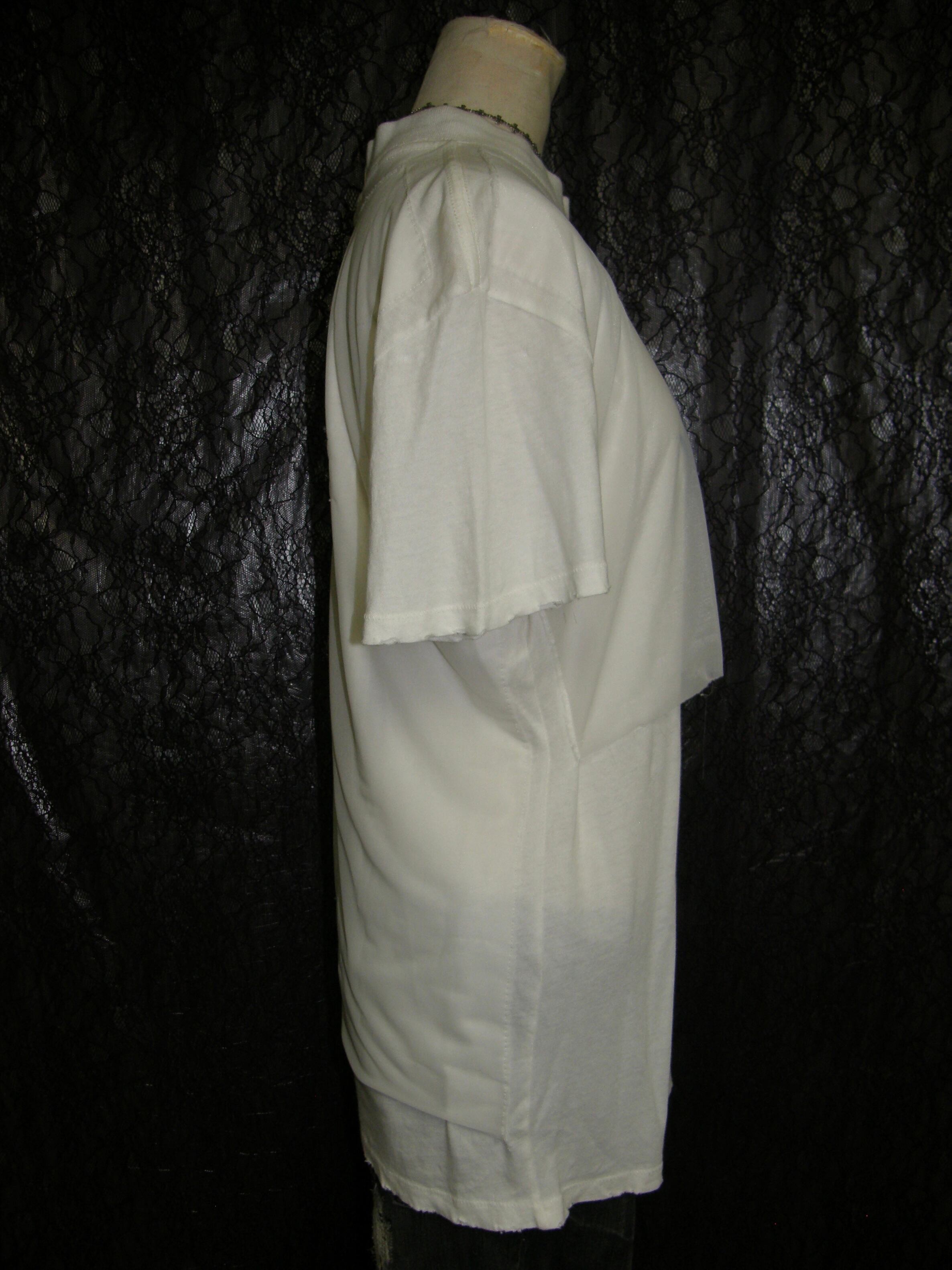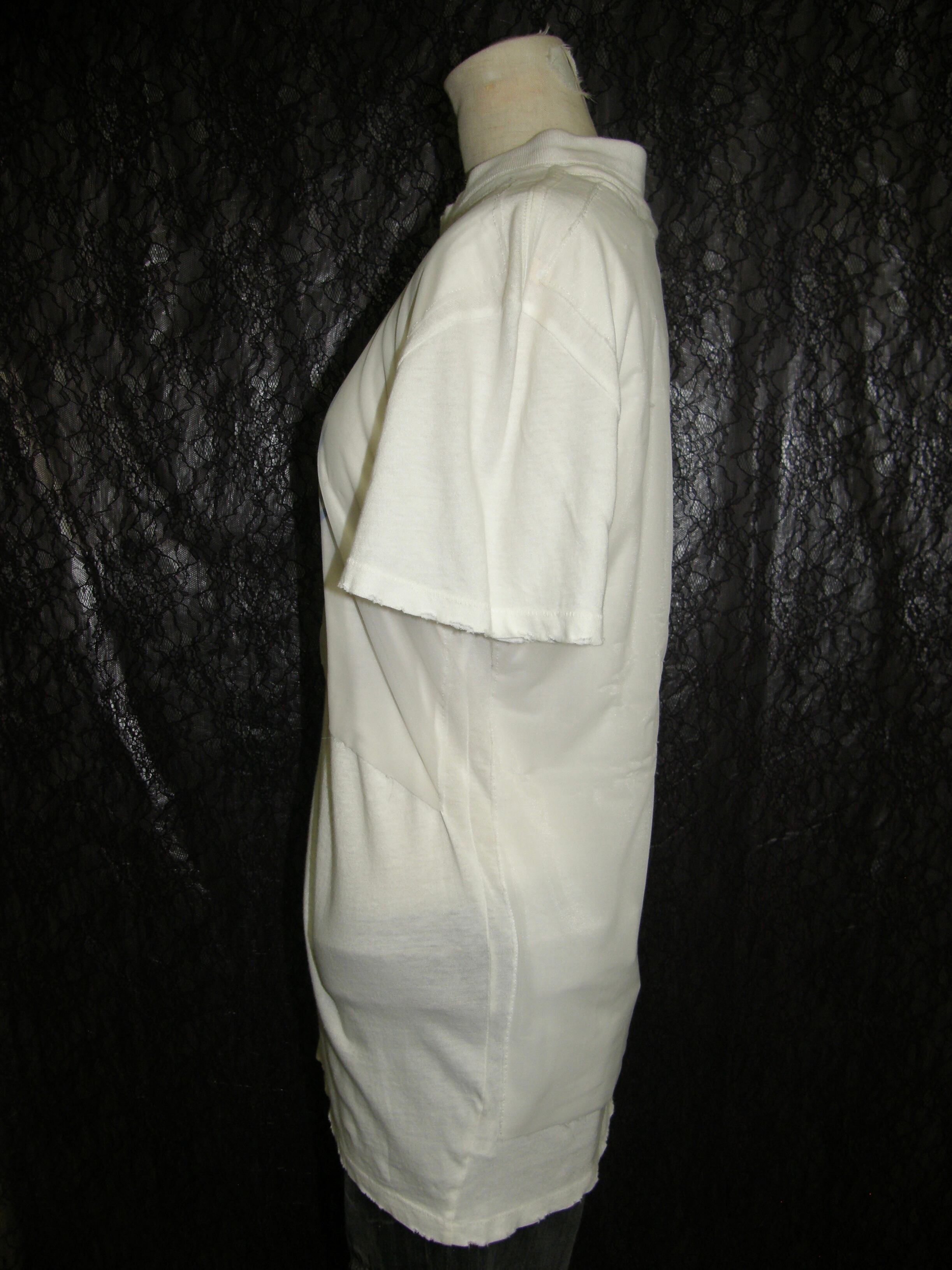 Tシャツと同色の白のオーガンジーが縫い付けられており、そのつれ感や縫い目、ダメージになっている袖や裾の野暮ったさが魅力です。