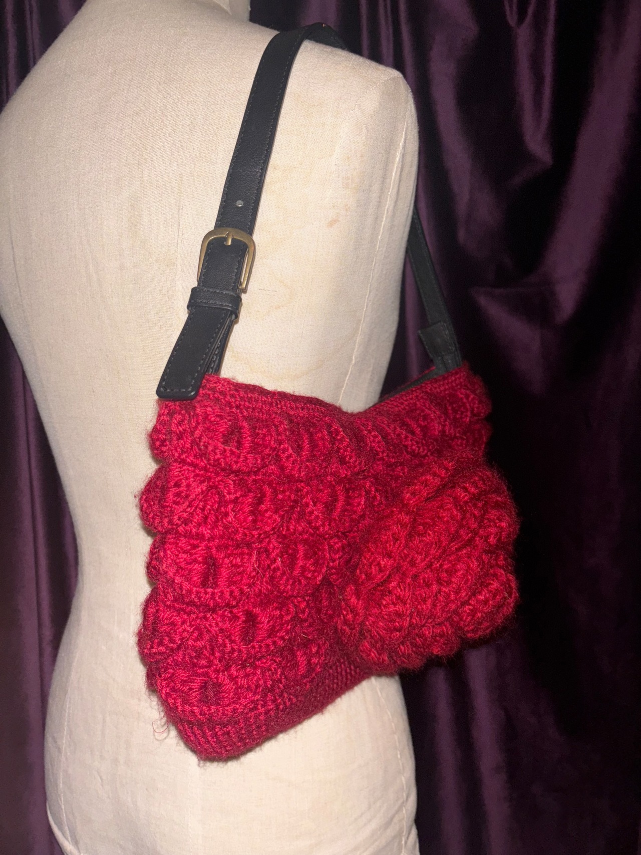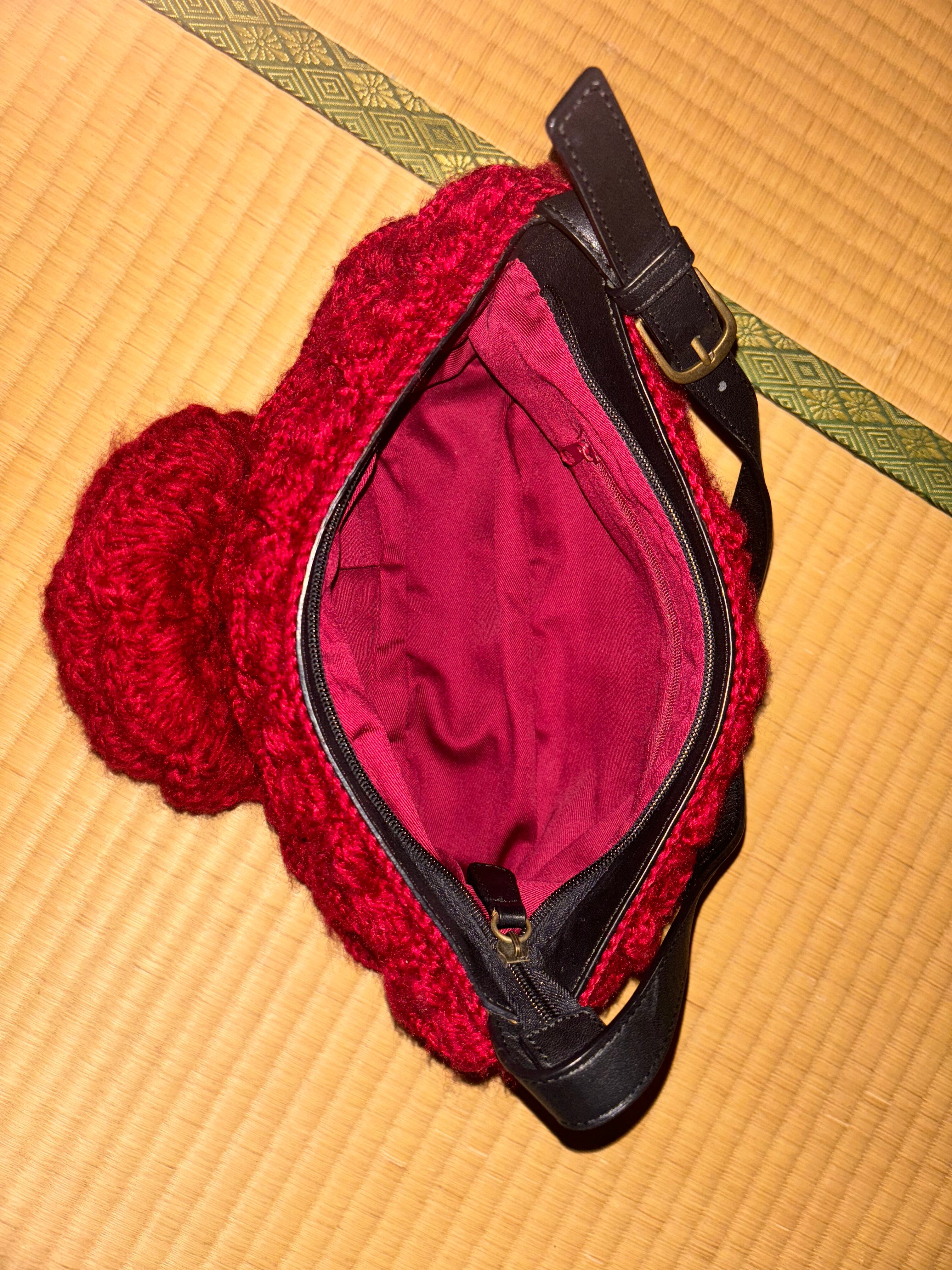 シンプルなニットハンドバッグに手編みで編んだ大きな薔薇を付けてアレンジを加えたバッグ。